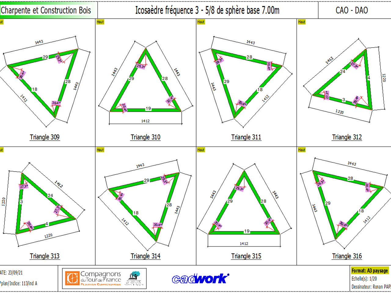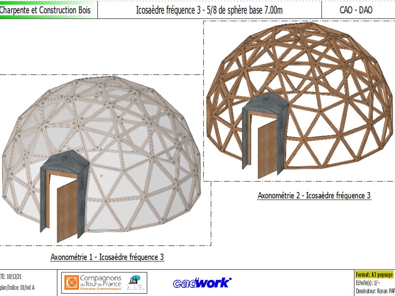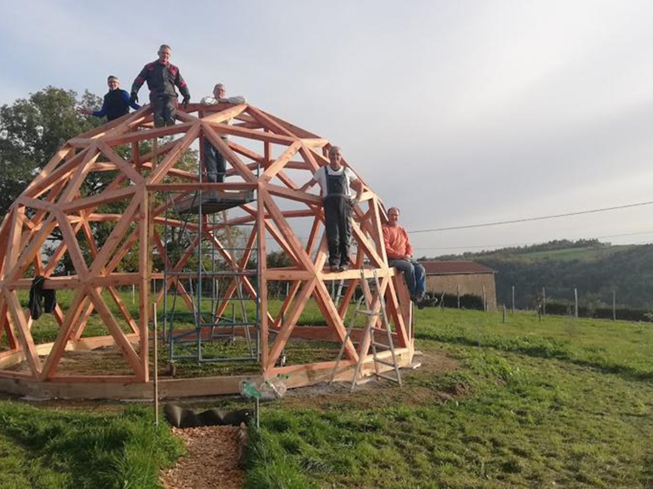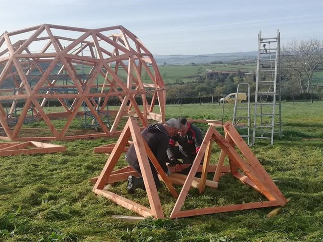 Fabrication d’un dôme géodésique de fréquence 3 pour la société maraichère « Les Carrés Jardin » située dans la Loire. Ce dôme fait 7.00m de diamètre, 4.20m de haut. La ceinture basse servant d’appui au dôme est composée de 15 traverses en 12x20cm en chêne. La structure principale en douglas est composée de 310pièces. Chaque arêtier/noue est composé de deux demi chanlattes de 6x10cm. Chaque triangle a été assemblé séparément avant un montage à blanc de l’ensemble en atelier (cf. photos du montage) puis redémontage en conservant chaque triangle assemblé. L’entreprise a remonté l’ensemble en une petite journée sur site.