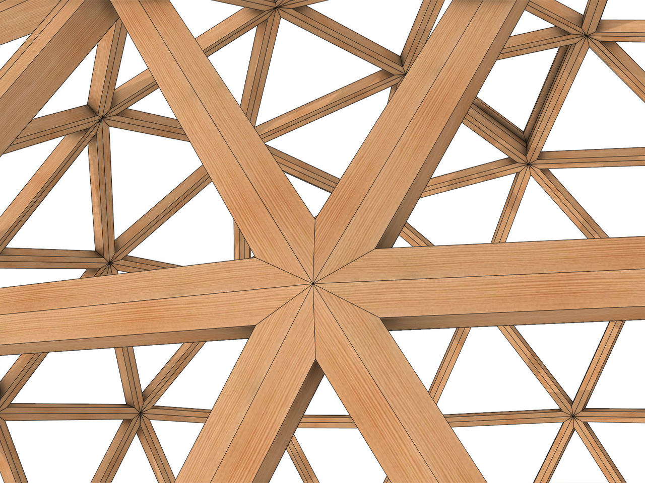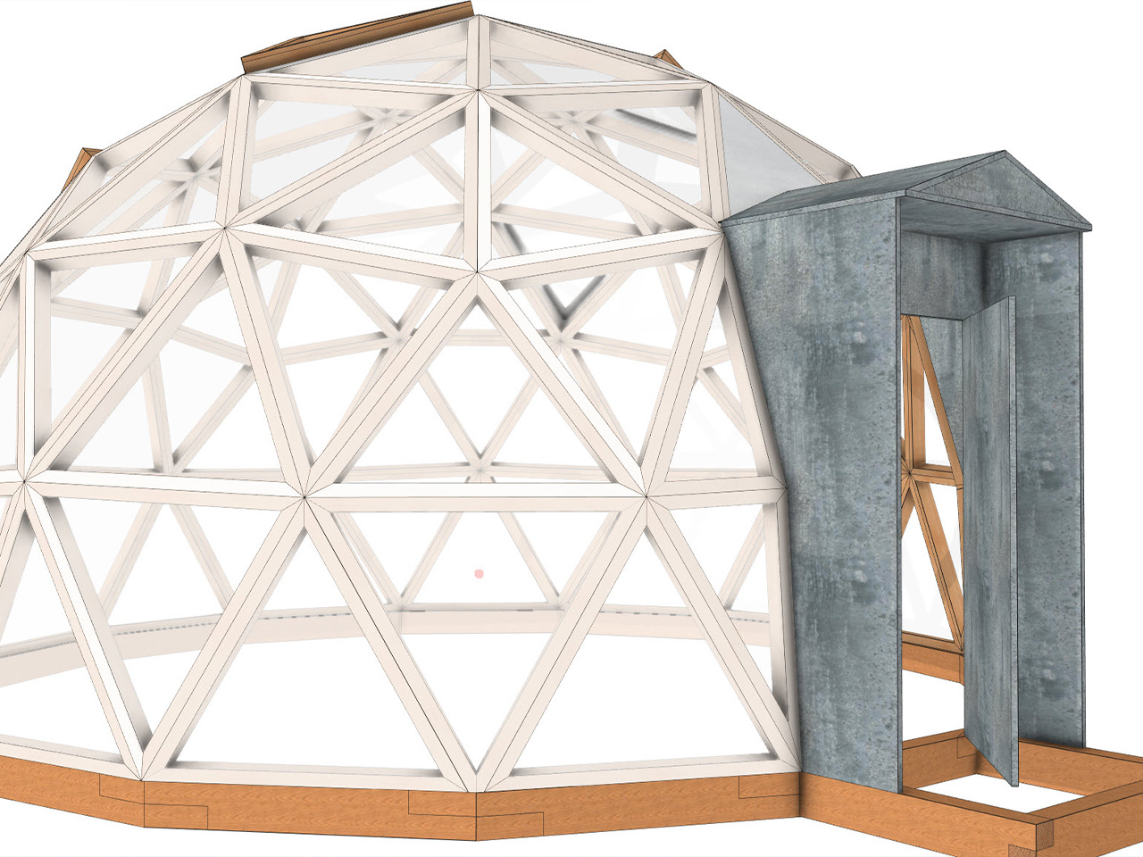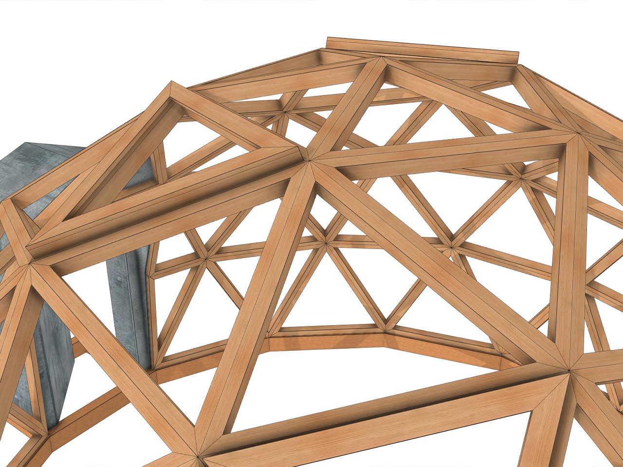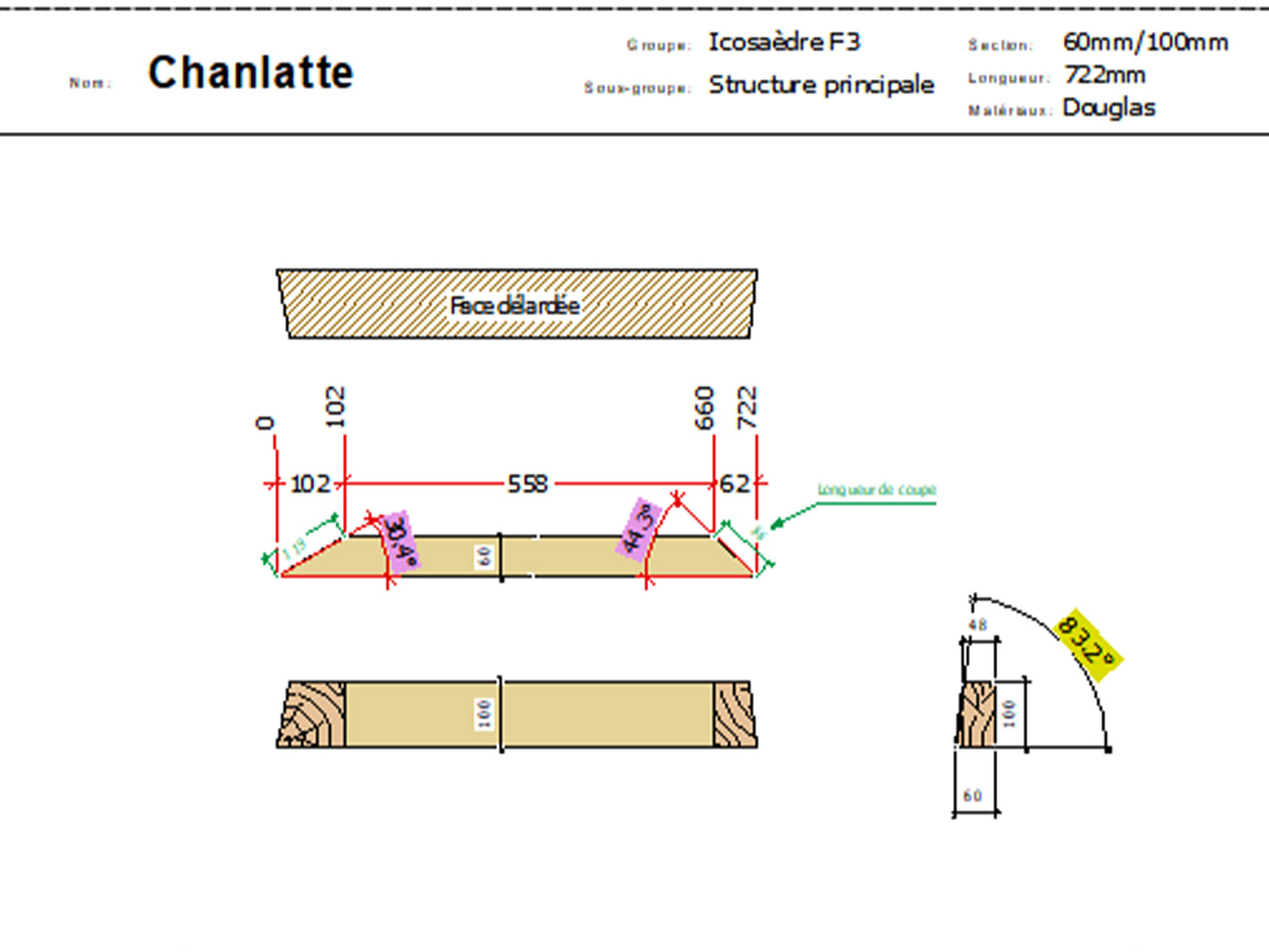 Fabrication d’un dôme géodésique de fréquence 3 pour la société maraichère « Les Carrés Jardin » située dans la Loire. Ce dôme fait 7.00m de diamètre, 4.20m de haut. La ceinture basse servant d’appui au dôme est composée de 15 traverses en 12x20cm en chêne. La structure principale en douglas est composée de 310pièces. Chaque arêtier/noue est composé de deux demi chanlattes de 6x10cm. Chaque triangle a été assemblé séparément avant un montage à blanc de l’ensemble en atelier (cf. photos du montage) puis redémontage en conservant chaque triangle assemblé. L’entreprise a remonté l’ensemble en une petite journée sur site.