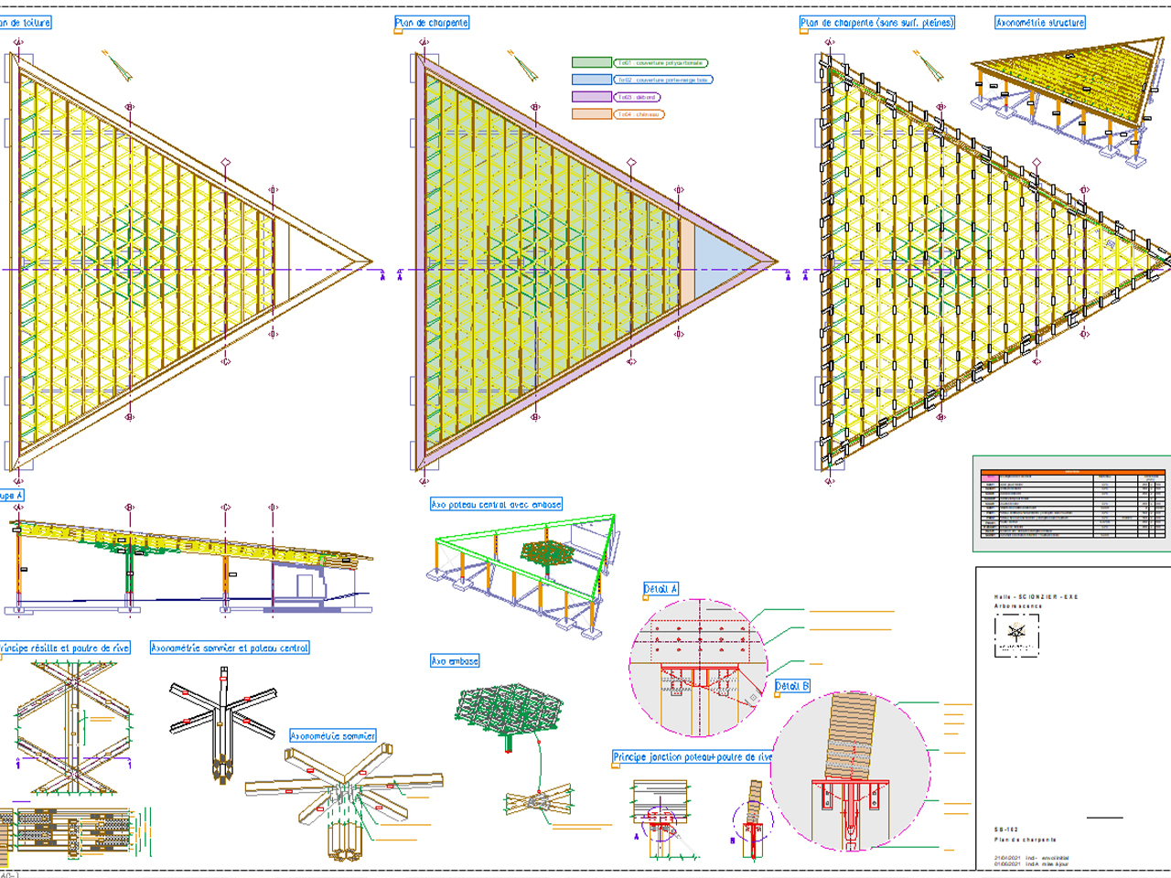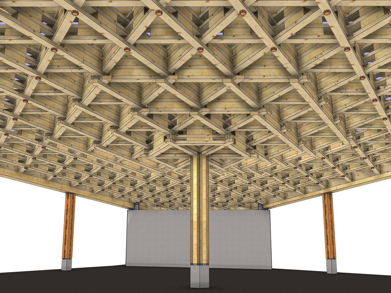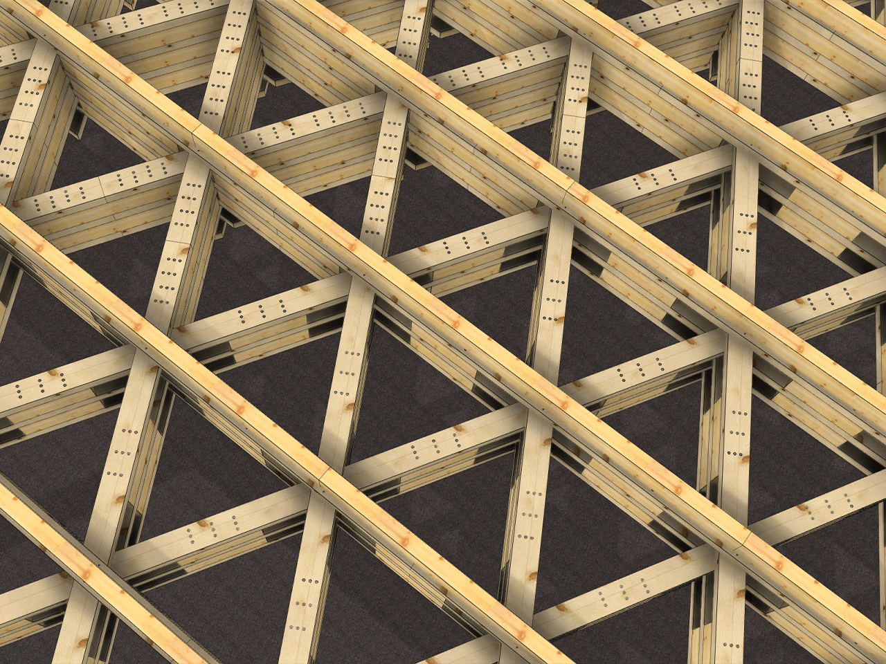 Une résille porteuse est réalisée par le croisement triangulaire de poutres reconstituées. Les poutres porteuses sont réalisées par l’empilement de 3 couches dans chacune des 3 directions connectées par des vis. Les intercalaires discontinus permettent de faire se croiser les 3 directions.