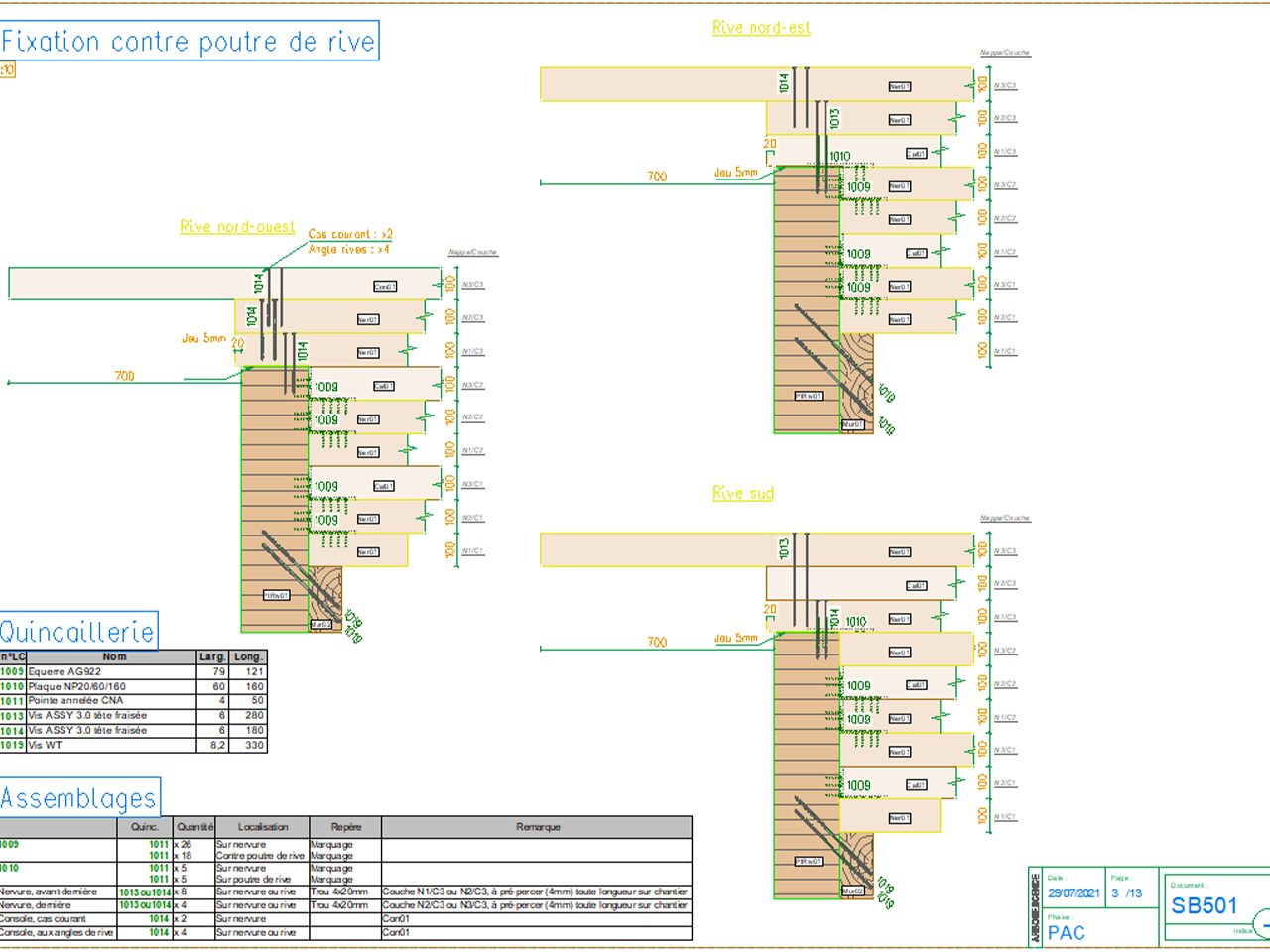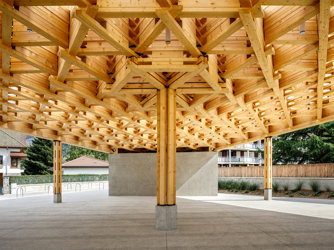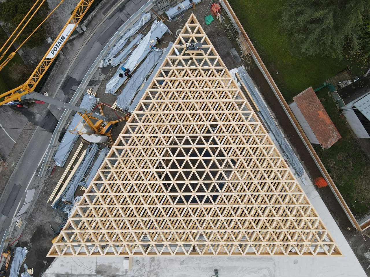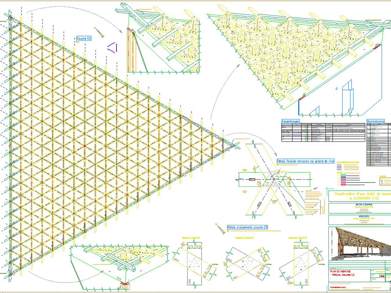 Une résille porteuse est réalisée par le croisement triangulaire de poutres reconstituées. Les poutres porteuses sont réalisées par l’empilement de 3 couches dans chacune des 3 directions connectées par des vis. Les intercalaires discontinus permettent de faire se croiser les 3 directions.