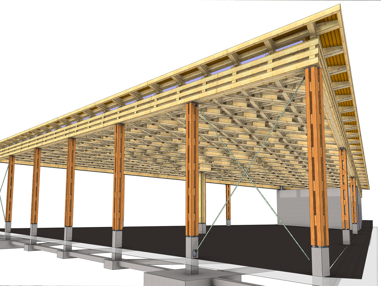 Halle de marché couvrant 673m². La toiture triangulaire est en une pente générale à 10%, recouverte de polycarbonate.