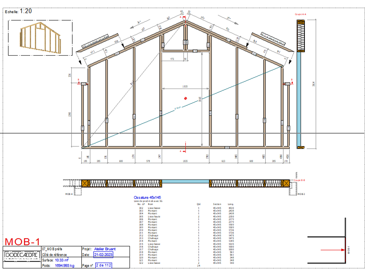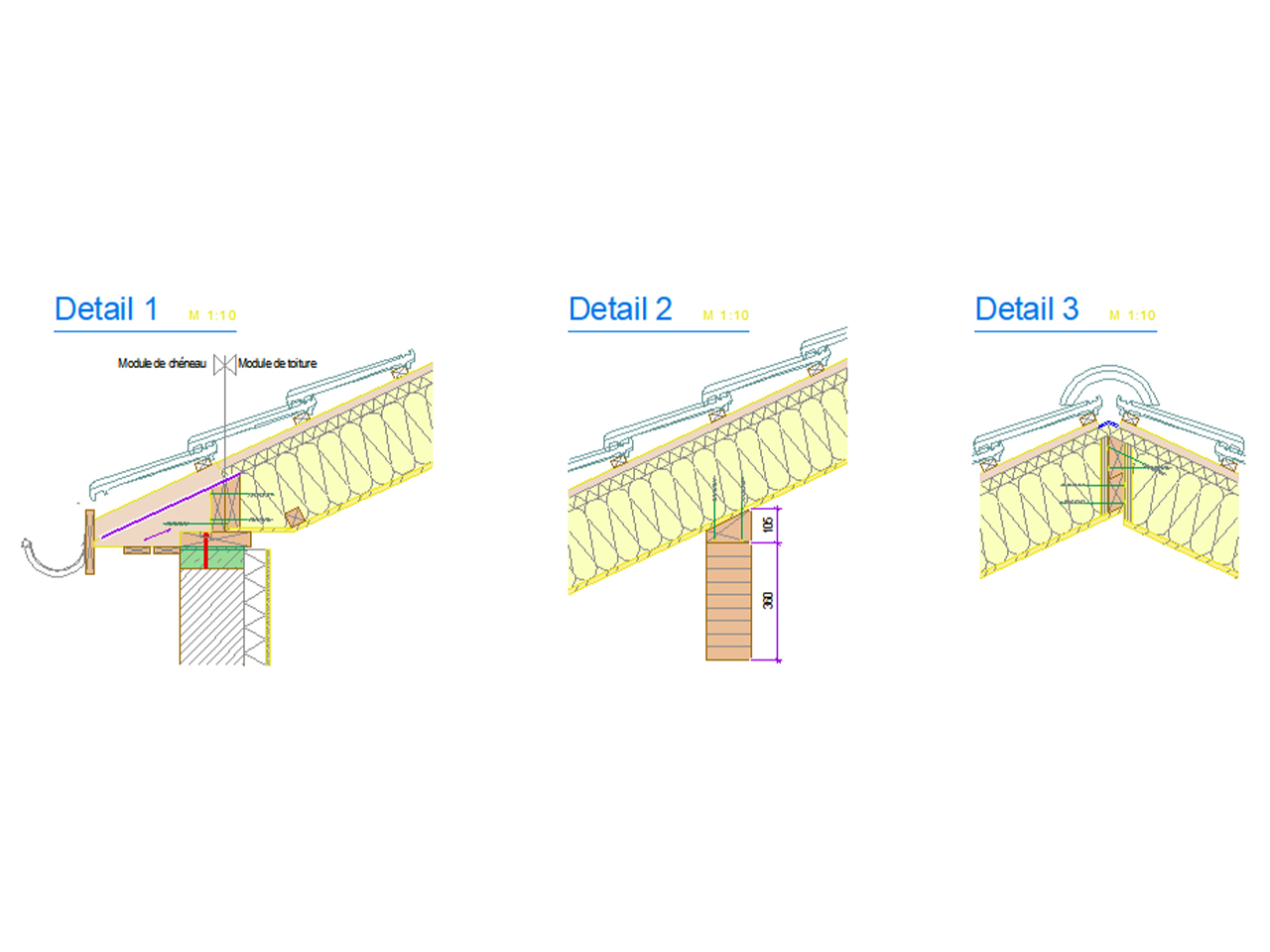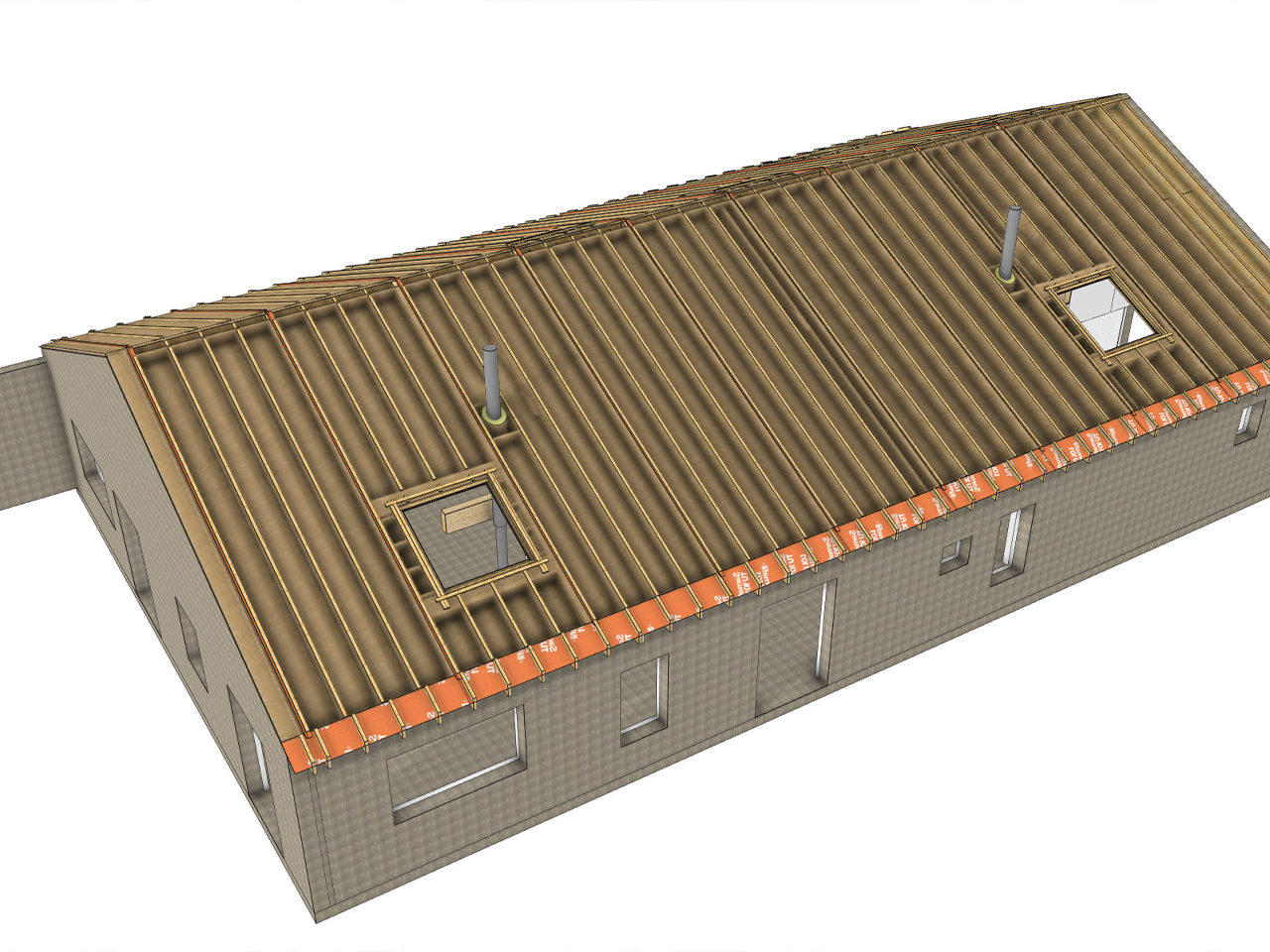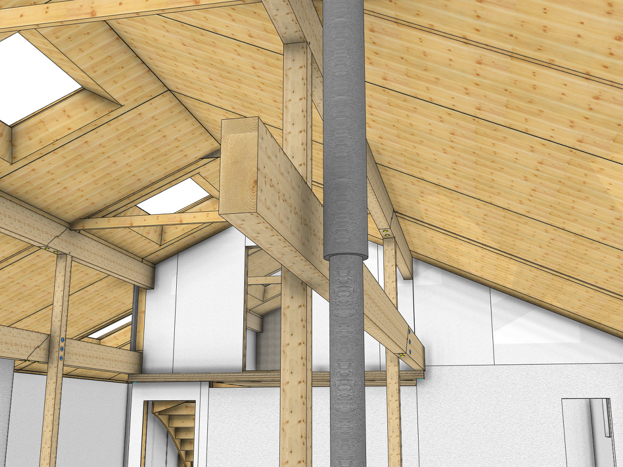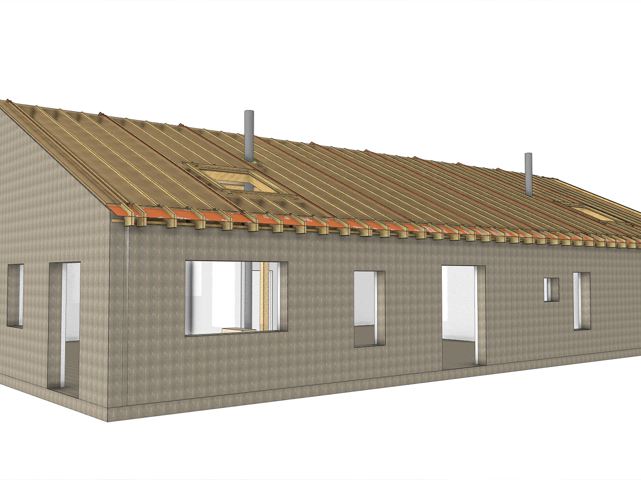 Les fermettes sous-dimensionnées étaient endommagées. Nous avons fait le choix de gagner de l’espace avec une structure poteau-poutre et un plafond cathédrale, et de poser la préfabrication au maximum : les caissons de toiture ont été posés isolés avec finition intérieur en 3-plis et fibre de bois prête à être étanchée, les dormants de fenêtre de toit étaient posés et hors d’eau.
