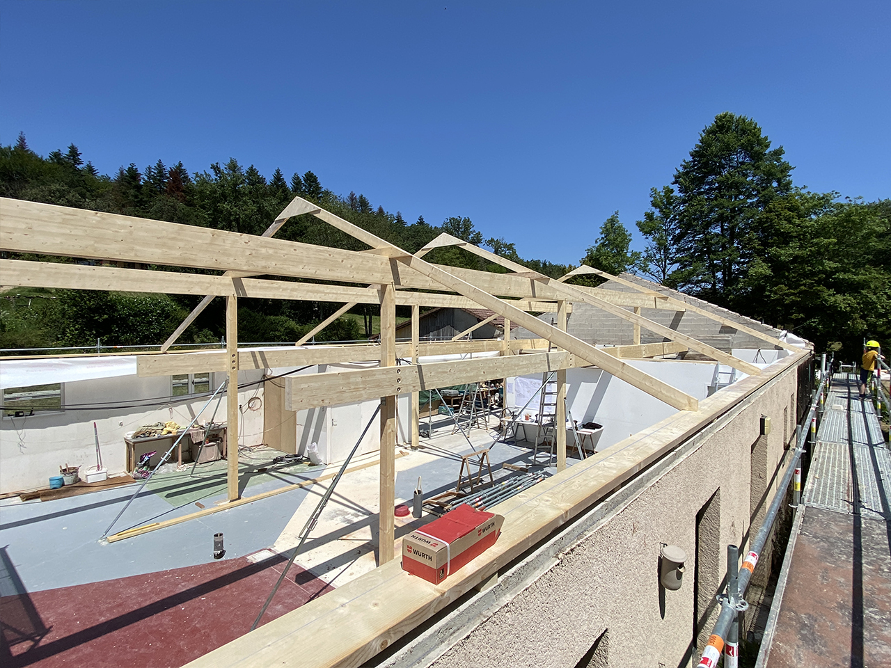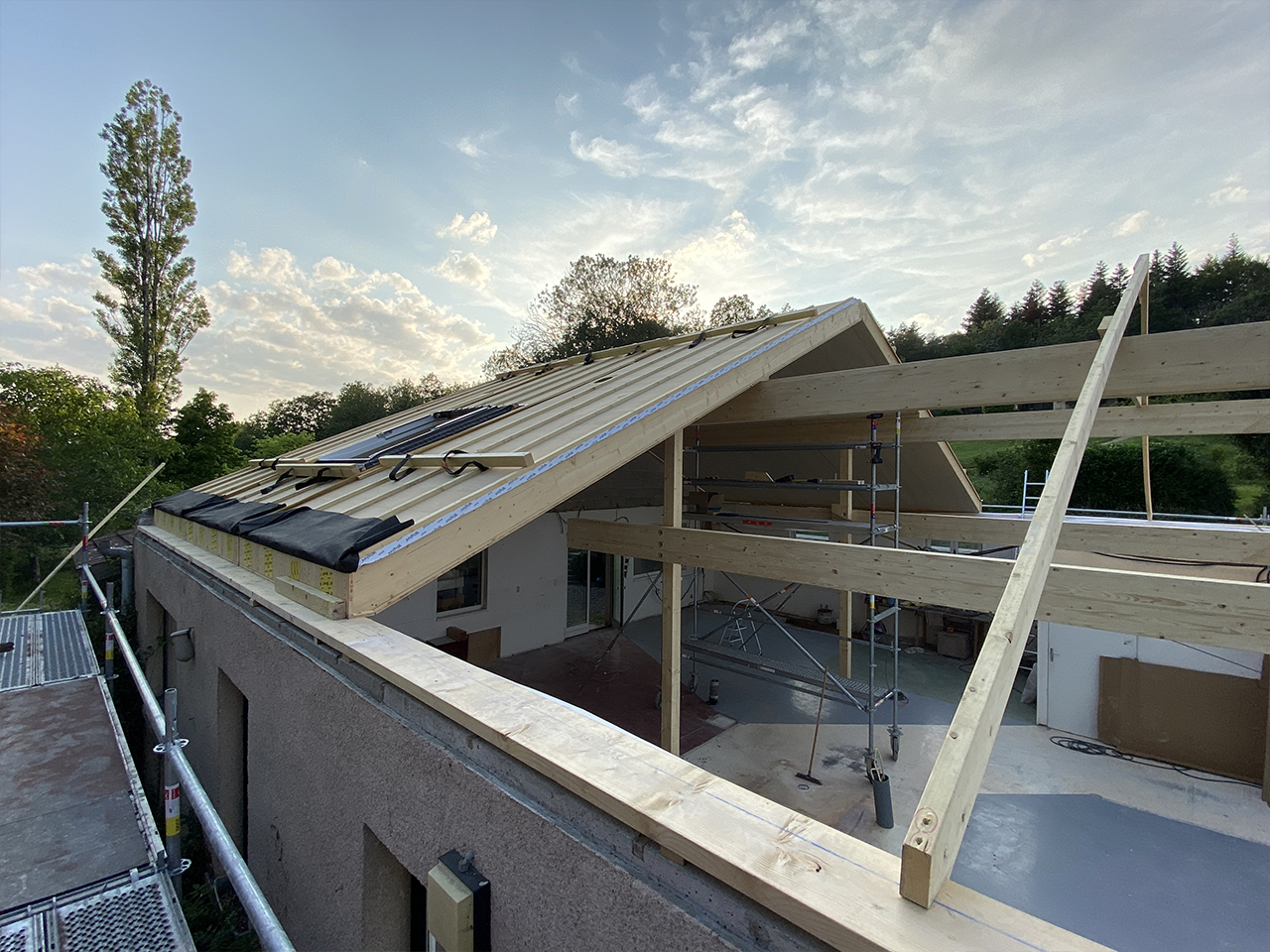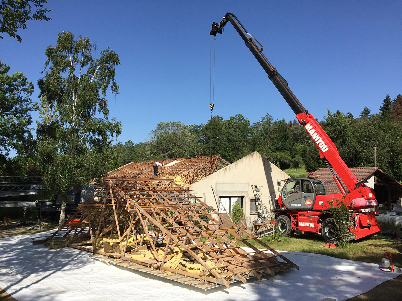 Entre la dépose de la première tuile et la mis hors d’eau du bâtiment se sont écoulés 5 jours, ce qui a permis de garder tout l’intérieur au sec (bonne météo aidant !).